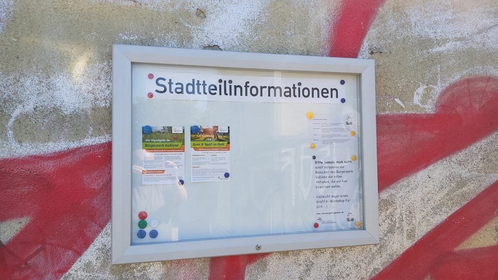 Wir hatten immer wieder Anfragen, wann findet denn wieder was auf dem Bürgerpark statt und wo findet man die Informationen dazu? Wir haben dafür einen Schaukasten direkt am Trafohaus angebaut. Hier stehen jetzt Veranstaltungsinformationen und Kontaktdaten zum Bürgerpark.
