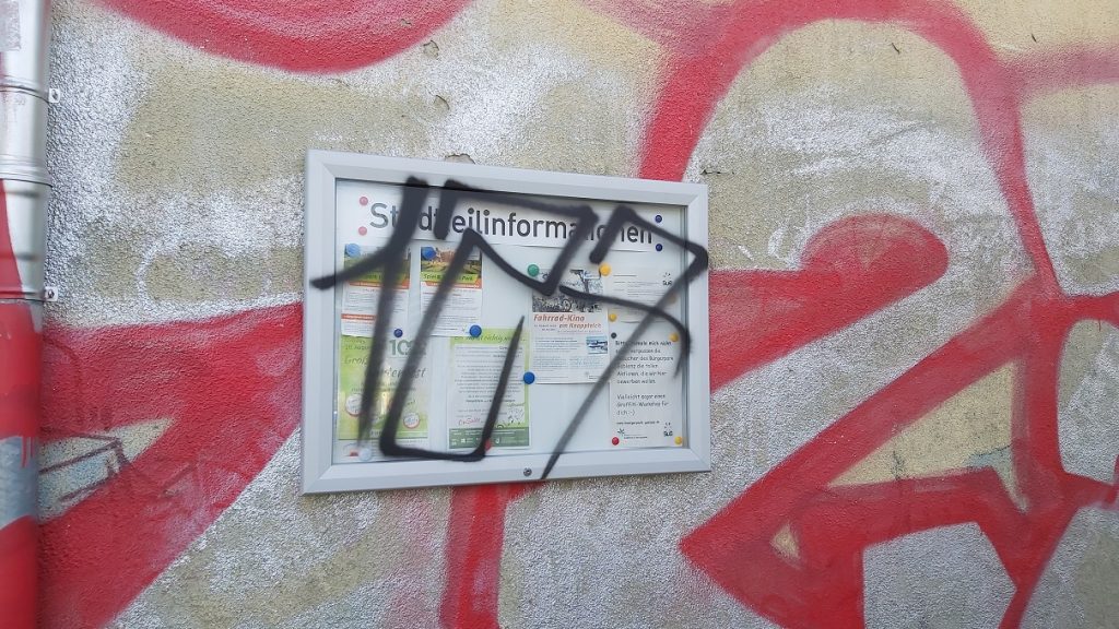 Leider wurde schon nach kurzer Zeit der Schaukasten „bemalt“. Wir zeigen diese Beschädigungen natürlich bei der Polizei an.