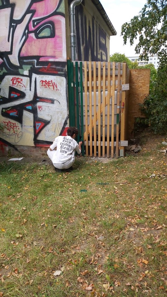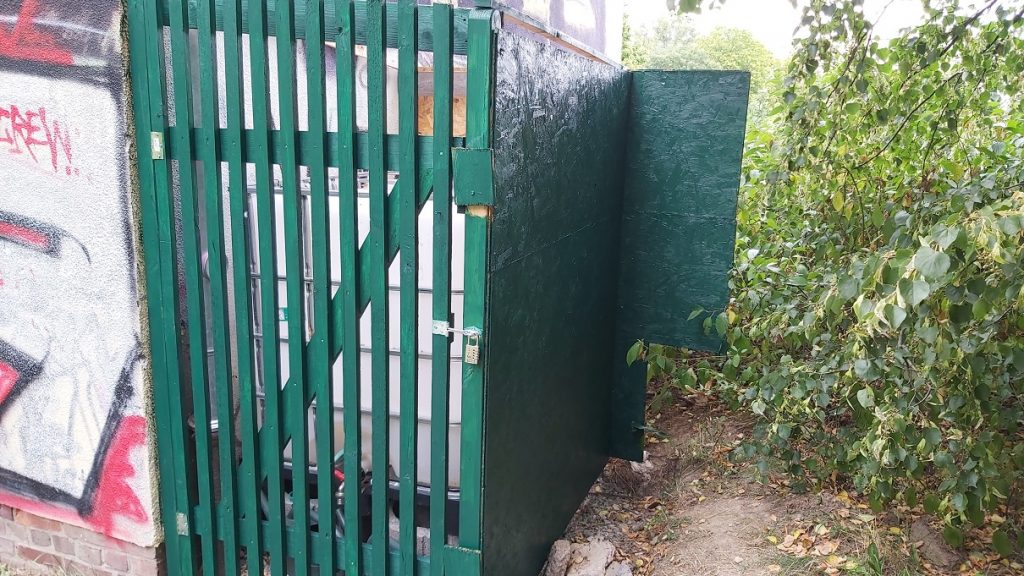 Hinter dem Trafohaus haben wir einen Wasserbehälter stehen, der mit einer kleinen Behausung versehen wurde – zum Schutz. Danke an den Helfer für die farbliche Aufwertung.